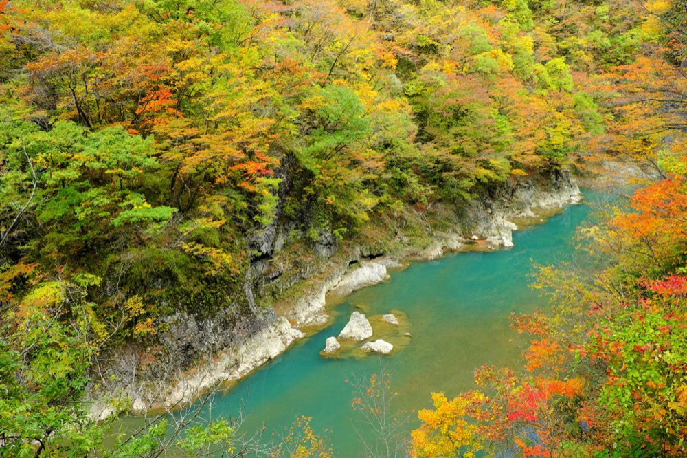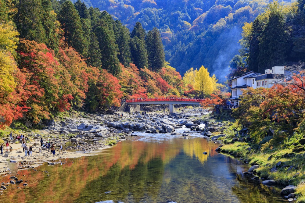 而位於靜岡的「寸又峽」,最為人所知的「夢之吊橋」,從橋上可以觀賞藍綠澄淨的水色,周圍是各色楓葉爭奇鬥豔,最重要的是觀光客很少,是秋天必訪的日本仙境之一。