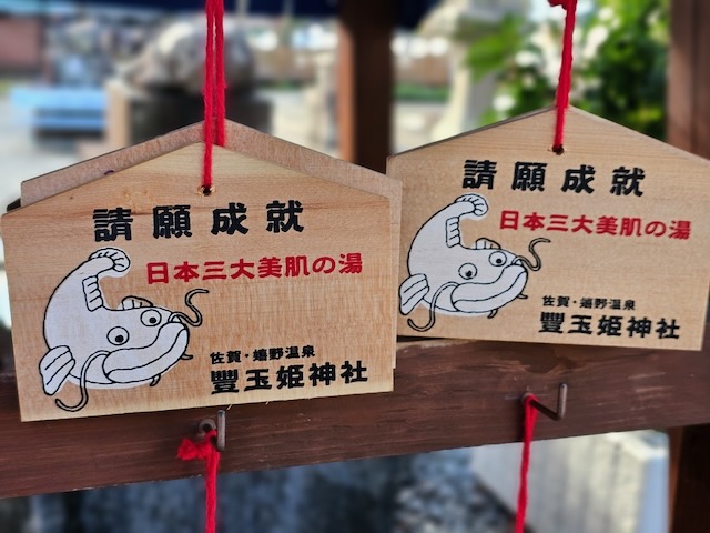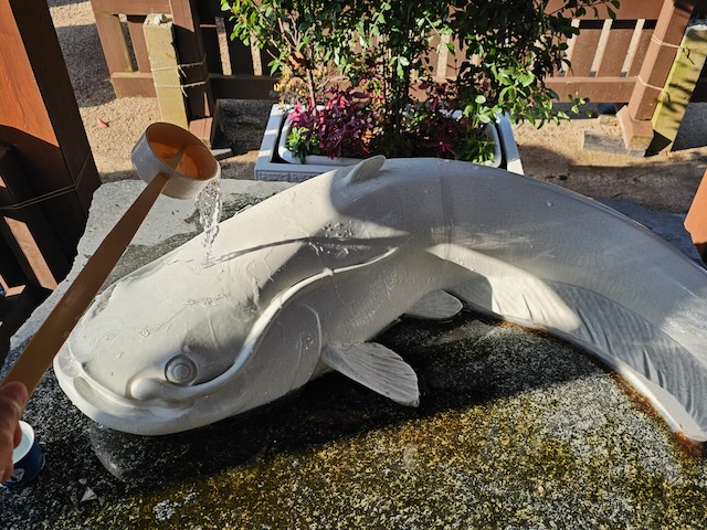 吃飽了,再上路。穿梭嬉野市區的小巷,跟沿途巧遇的貓咪們打招呼,抵達了「豐玉姬神社」。這座神社以美肌祈願和其「白鯰神像」聞名,結合著歷史與靈氣,主祀是海神與水神——豐玉姬命,傳說她掌管水與生命的平衡,因此,神社漸漸成為人們來祈求美麗與健康的能量之地。特別是白鯰神像,因為象徵著肌膚平滑細緻,所以吸引了許多希望膚質變得美好的遊客來參拜。