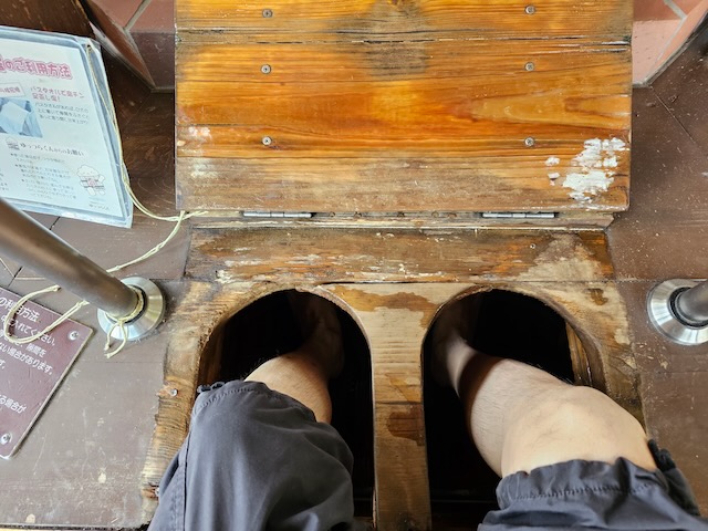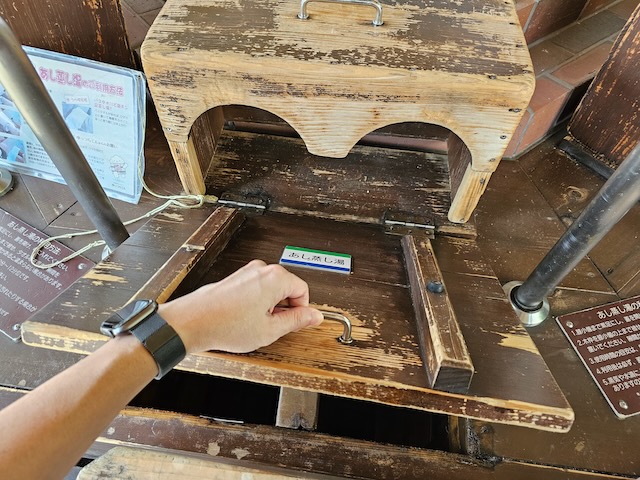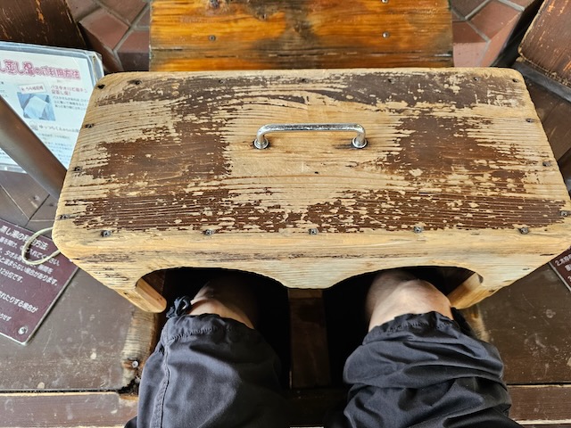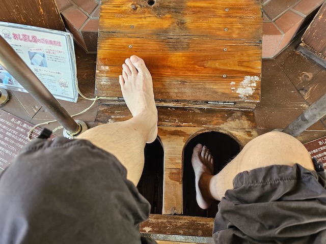 貼心提醒,進行足蒸溫泉體驗,兩隻腳伸進木箱裡時,最好不要腳板整個平放在木板上。以腳後跟著地,腳板稍微騰空的姿勢為佳,因為這樣比較不會感覺燙。