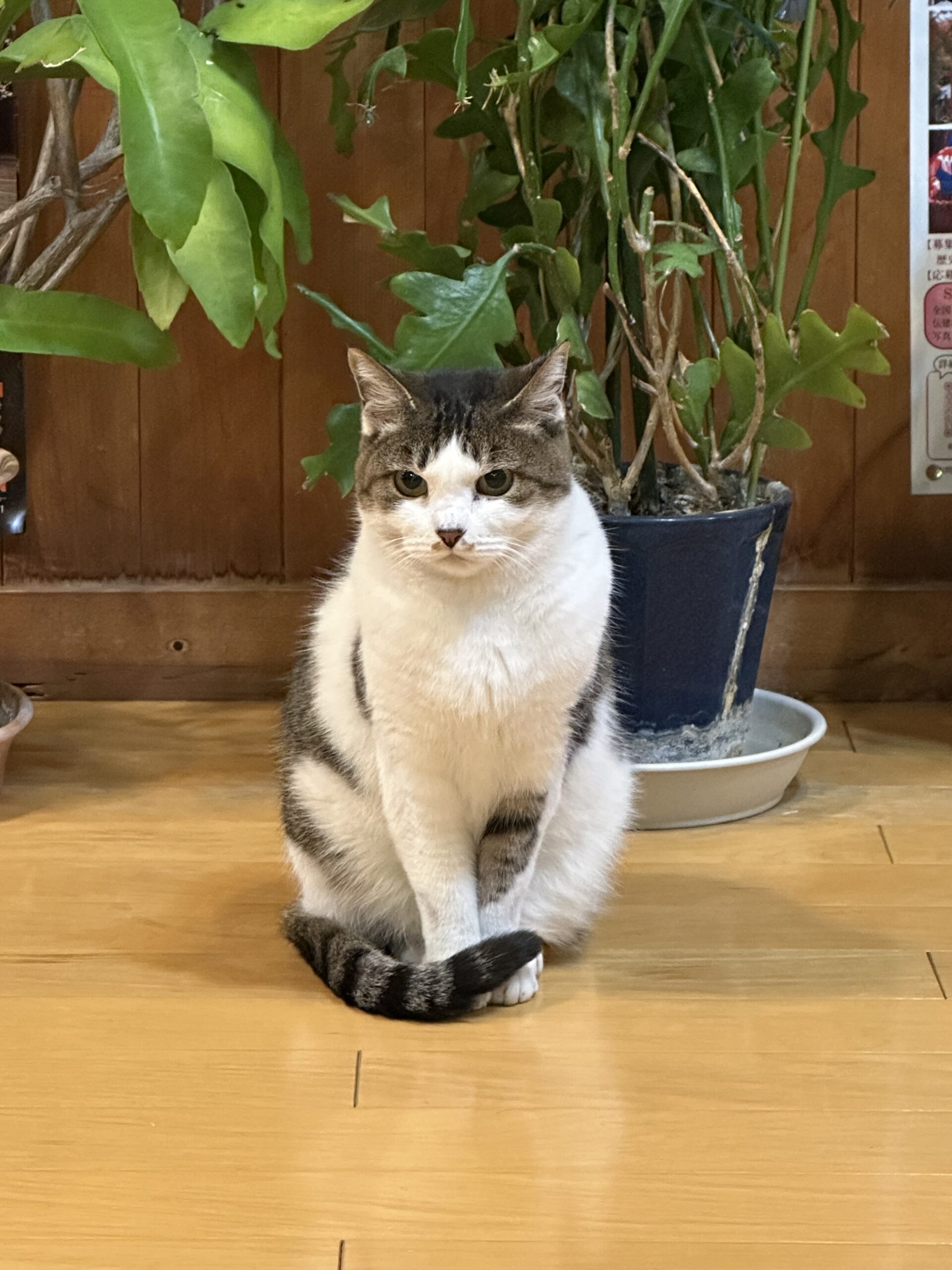 到訪的這一天,辦理入房手續時,我其實還沒有見到「鈴」的身影。等到吃完晚餐,回到旅館去泡湯時,才看見牠出來「執勤」。這可能是牠每一天的工作。夜幕低垂以後,在旅館大廳,男湯女湯的暖簾之前,牠面對大門,直挺挺地優雅佇立著,彷彿像在送往迎來每一個泡湯客,或者等候著誰還沒回家,讓人有一種被守護的溫暖。
