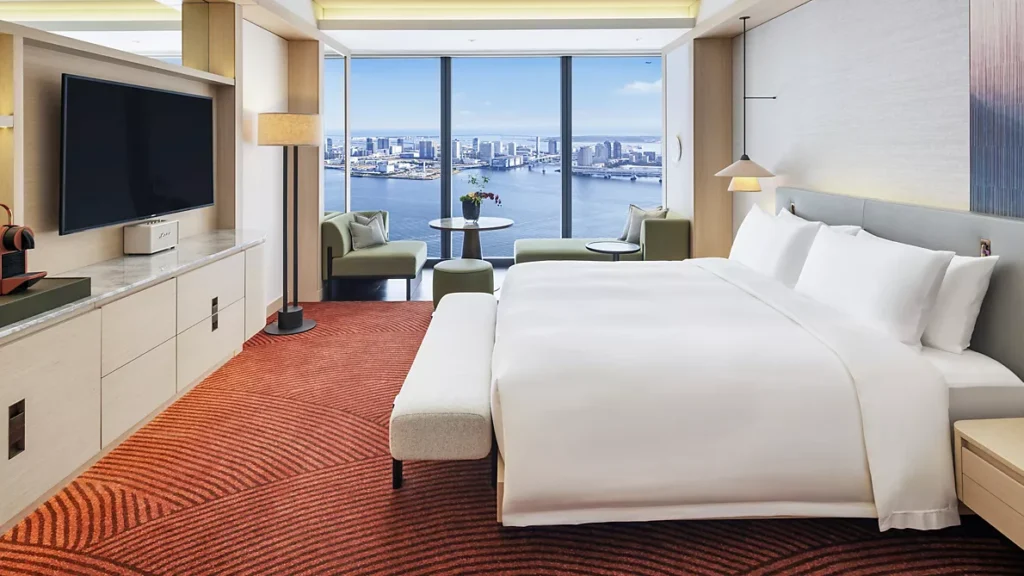 東京費爾蒙酒店位於芝浦高層建築群「BLUE FRONT SHIBAURA」35至43樓,西望東京塔、東眺東京灣,盡享城市繁華與水岸寧靜。酒店交通便利,距離羽田機場僅13分鐘,前往東京站、品川站亦僅需6分鐘,並與濱松町站直通,成為國際旅客理想落腳地。