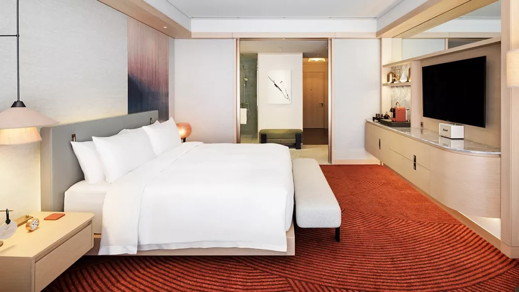 酒店擁有217間寬敞客房(含29間套房),每間房型皆設有大片落地窗與自然採光,特別設計的「緣側」式座席區,巧妙融合日式靜謐與都市景觀。頂層的「費爾蒙金牌樓層」提供專屬貴賓休憩空間與客製化服務。