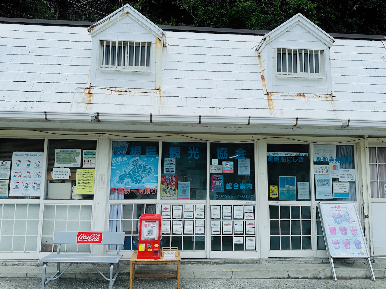 入境隨俗,港口邊的「式根島觀光協會」當然也是扮演多重角色。室外擺扭蛋機,室內賣當地紀念品。窗口除了提供觀光諮詢以外,還處理販售前往新島的聯絡船票。最特別的是,觀光協會還兼賣「31冰淇淋」。