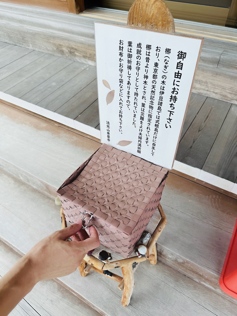 另外值得一提的是,在式根島觀光協會認識的田村先生,向我們極力推薦,到訪東要寺時一定要做的一件事。那就是如果在寺廟大堂前發現了一個小木箱的話,記得把木箱打開來。幸運的話裡面會放著梛樹的樹葉,那麼記得帶一片葉子走。