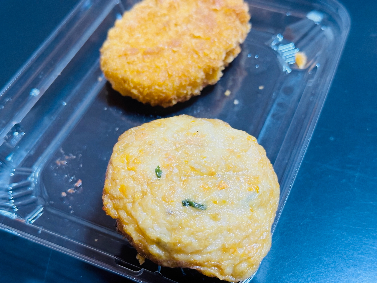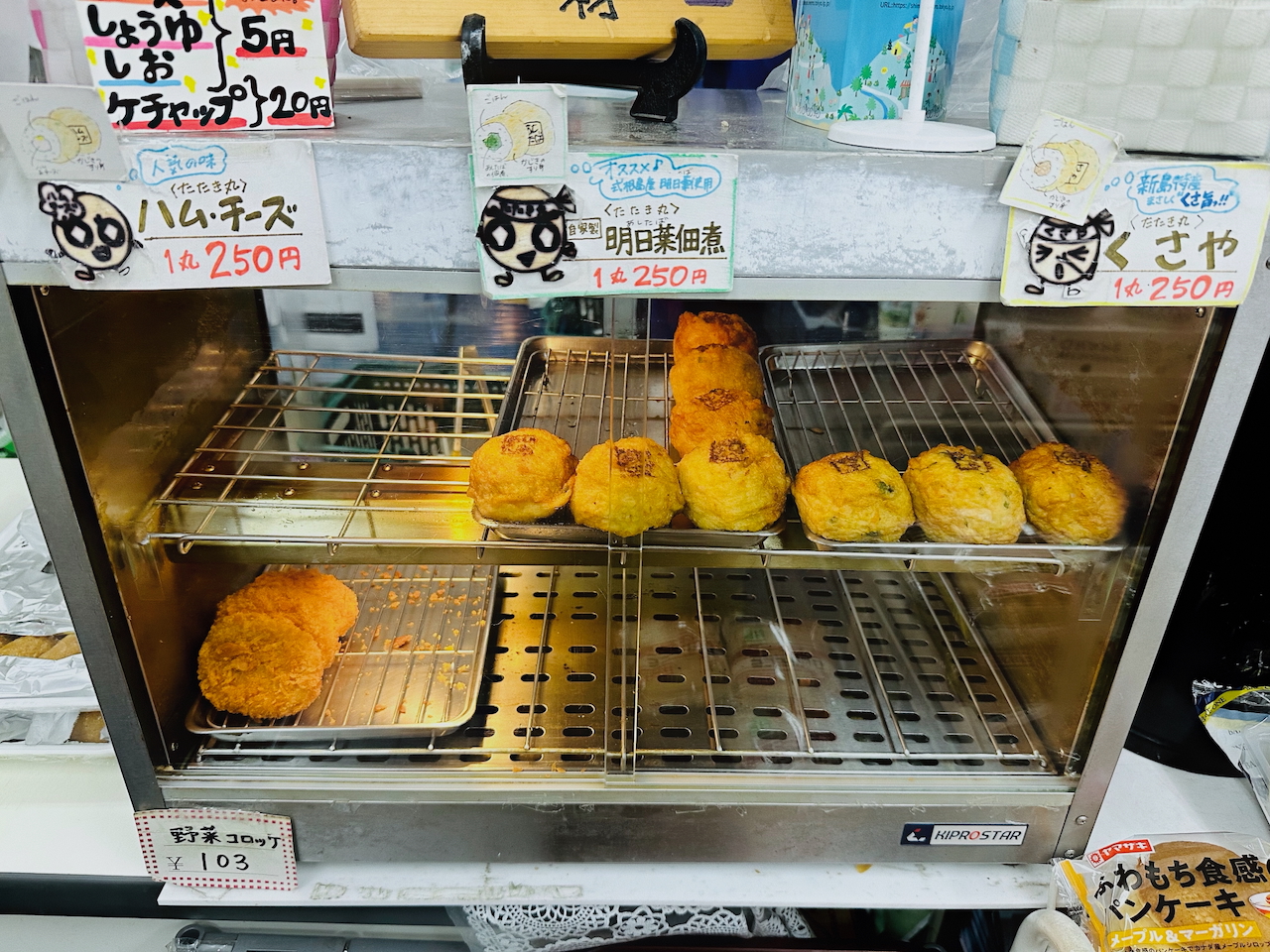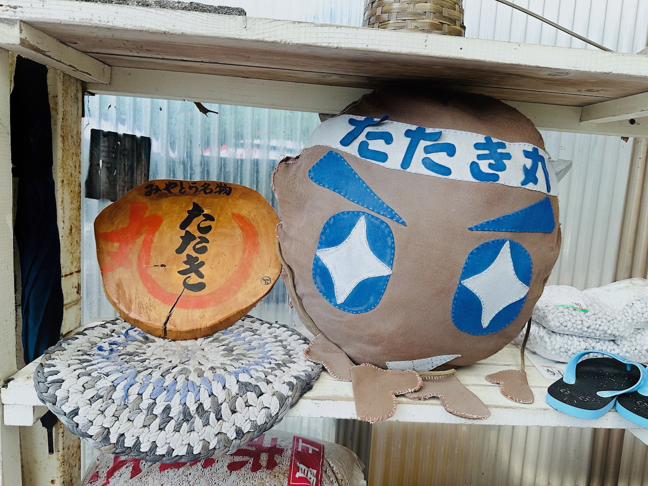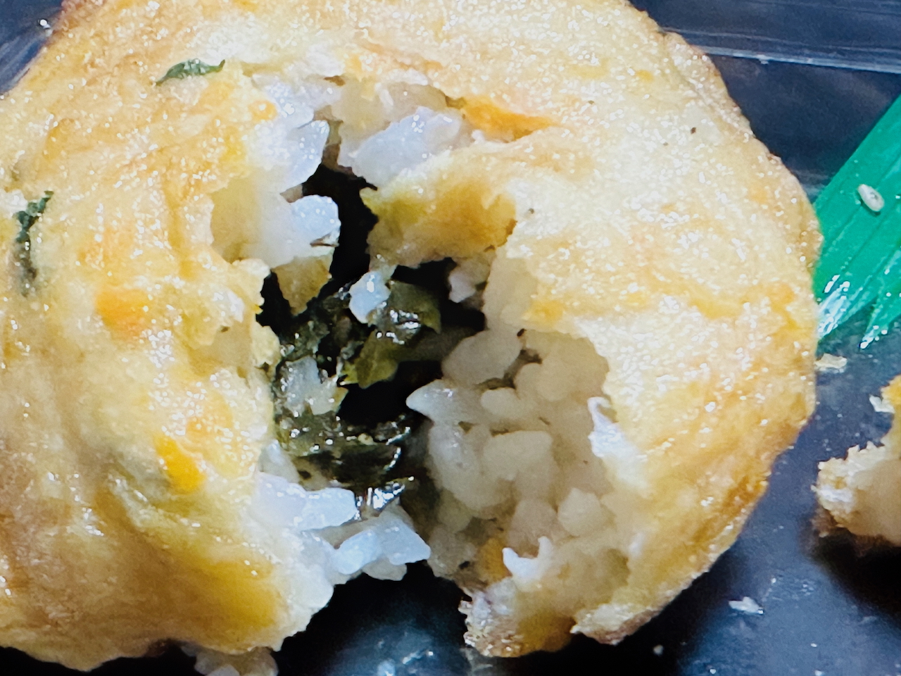 下午騎車時,曾經過一間雜貨店「MIYATORA」(みやとら),偶然發現這間店有賣一樣特別的限定名產——「Tataki-maru」(たたき丸)。這道料理靈感來自島上的傳統魚漿料理「Tataki-age」(たたき揚げ),經過創意轉化,成為旅人最愛的 B 級美食。做法是將米飯包入不同餡料,再裹上一層調味過的魚漿,最後炸成一顆顆渾圓小球。外層香氣撲鼻,口感外酥內軟,咬開後還能嚐到內餡的驚喜。
