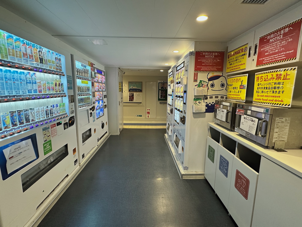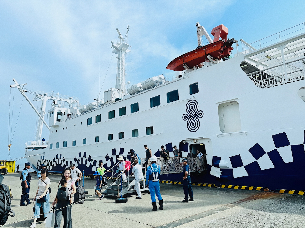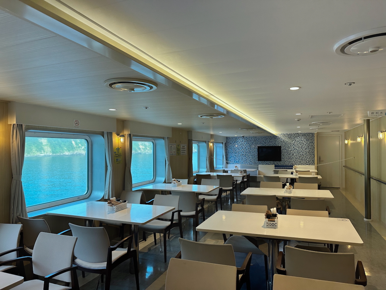 這艘大型客船是東海汽船旗下的第三代「さるびあ丸」(Salvia Maru),2020年啟用,可搭載約1300名乘客,設備新穎齊全。艙等多樣,從座席艙、榻榻米大通鋪、雙人床通鋪,到附衛浴的特等個室一應俱全;即使不是個人房,也能在公用浴室淋浴。公共空間有餐廳、觀景休憩區與寬敞的甲板,可隨時走出來感受海風。