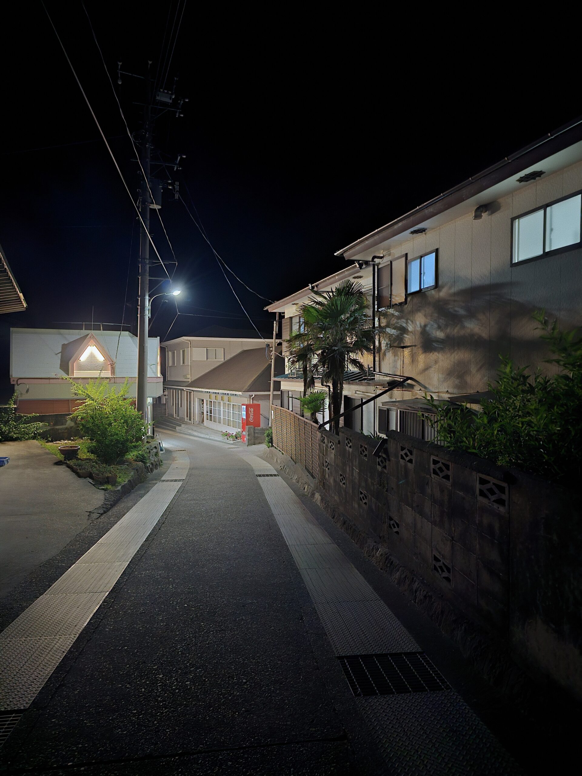 熱情的宮川媽媽還貼心地拉起鐵門,讓我們能拍到夜晚點燈與玻璃上宮川君留下的插畫。熄燈後,島中央的小路再次沉睡,恢復一片黑暗。