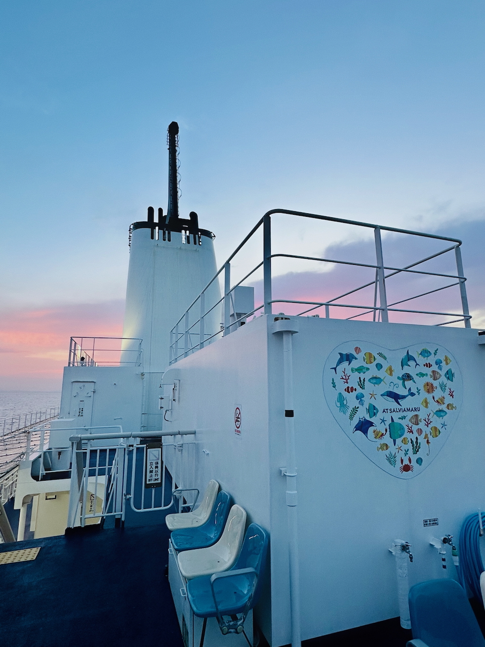 仔細想想,我似乎從未搭乘過夜間渡輪。這次前往式根島,特地選了晚上11點的班次,打算在船上睡一晚。從排隊魚貫進入船艙的那一刻起,我就按捺不住心中的雀躍。