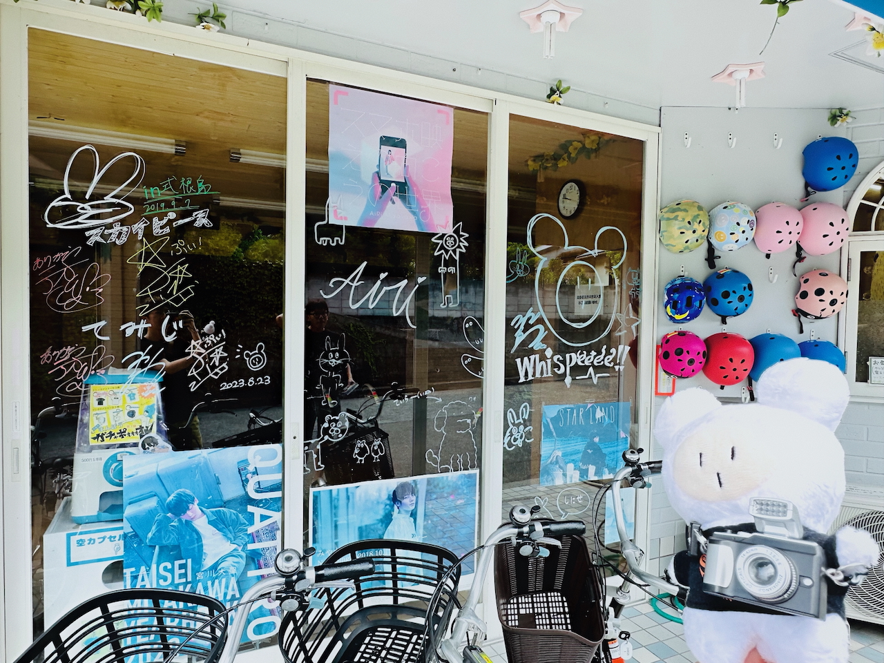雖然說租車是主要目的,但既然來到追星聖地,那麼拍照當然也是重點。MANBOW大門前張貼著宮川大聖的海報,玻璃上有他的簽名及親手繪製的插畫。我和旅伴一到,就開始忙著進行拍照工程,完全將租車這件事先拋在腦後。