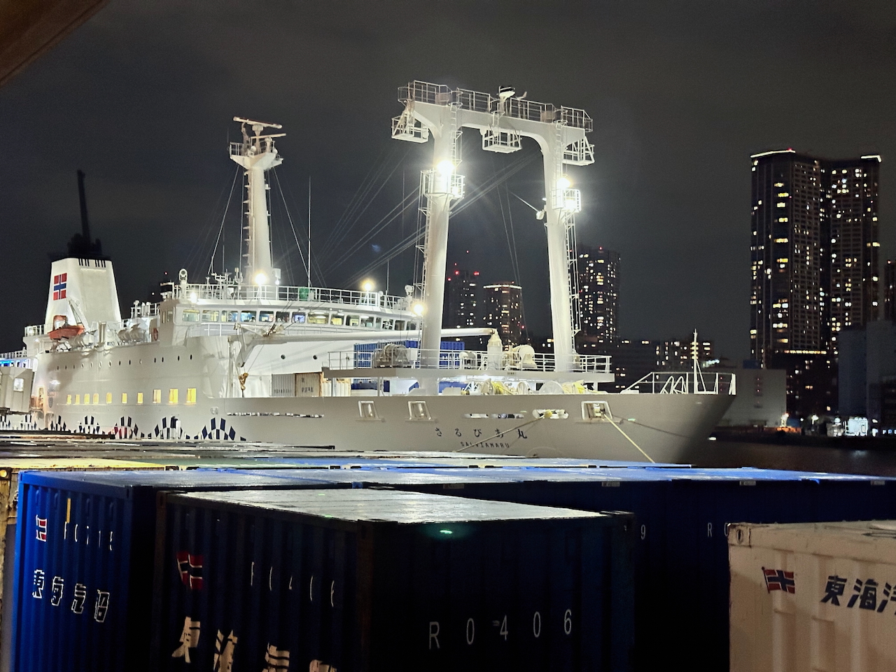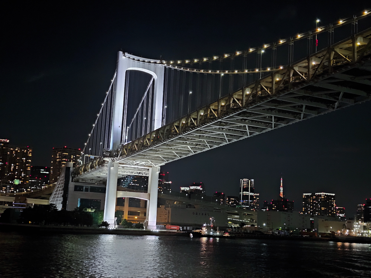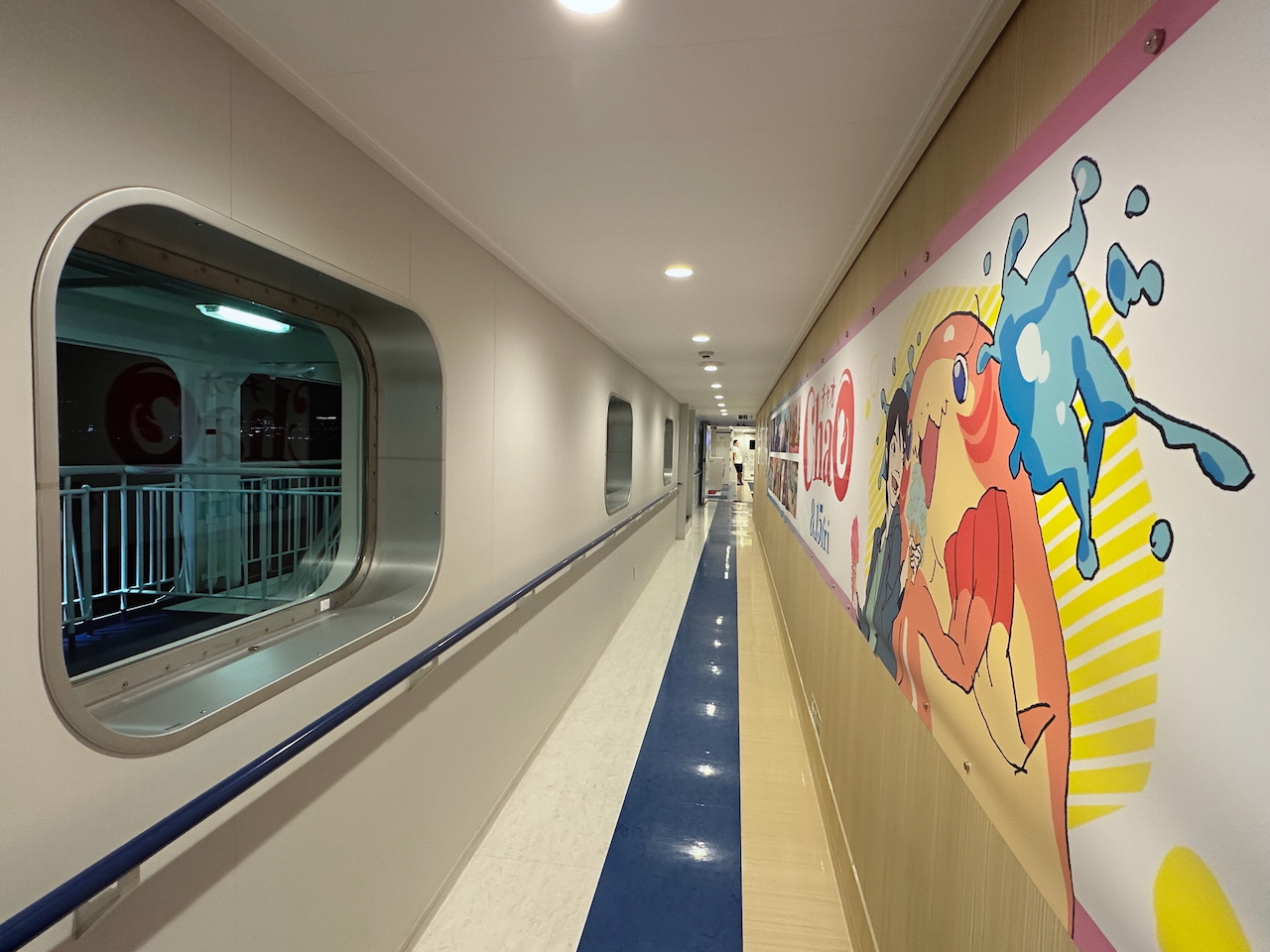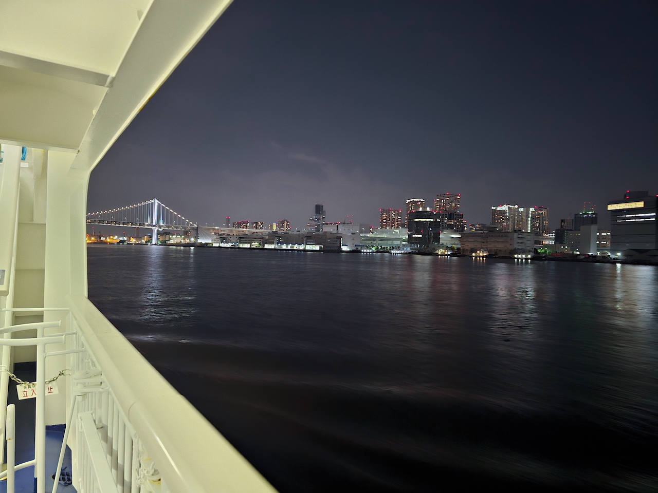 走進船內,先把行李放進臥房,隨即跑到甲板等候啟航。船身滑過彩虹大橋下方,向深夜依然閃耀的東京灣揮手道別。眼睛忙著張望,手機也沒停過拍照。