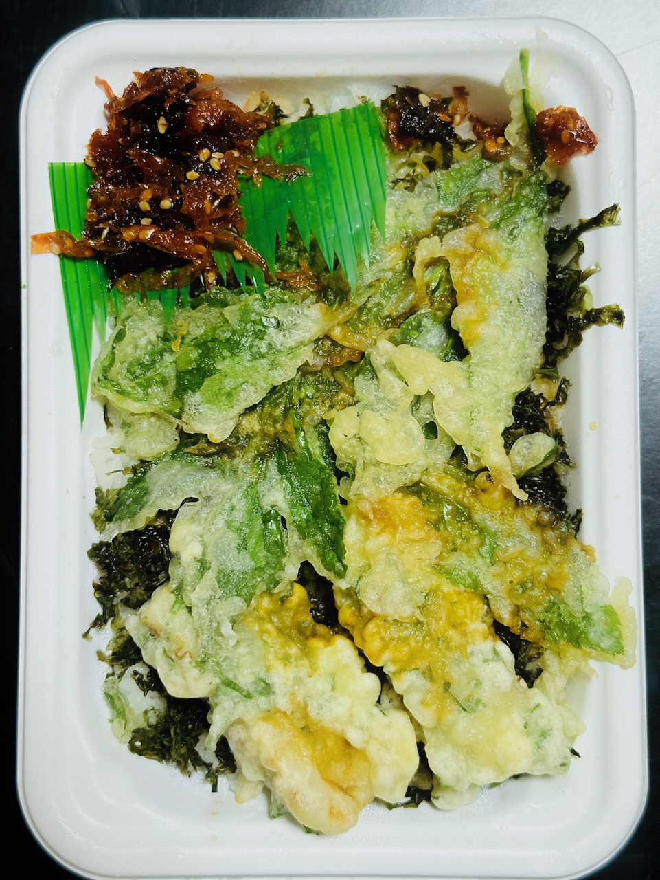 打開便當,看見滿鋪在白飯上的島產海苔,香氣濃郁,帶著磯味氣息。配菜同樣充滿地方特色,常見有以式根島特產「明日葉」製成的天婦羅、加入魚漿製成的「Tataki-age」(たたき揚げ),或是家常風的魚類佃煮,濃縮成一份簡單卻飽滿島味日常的美食。