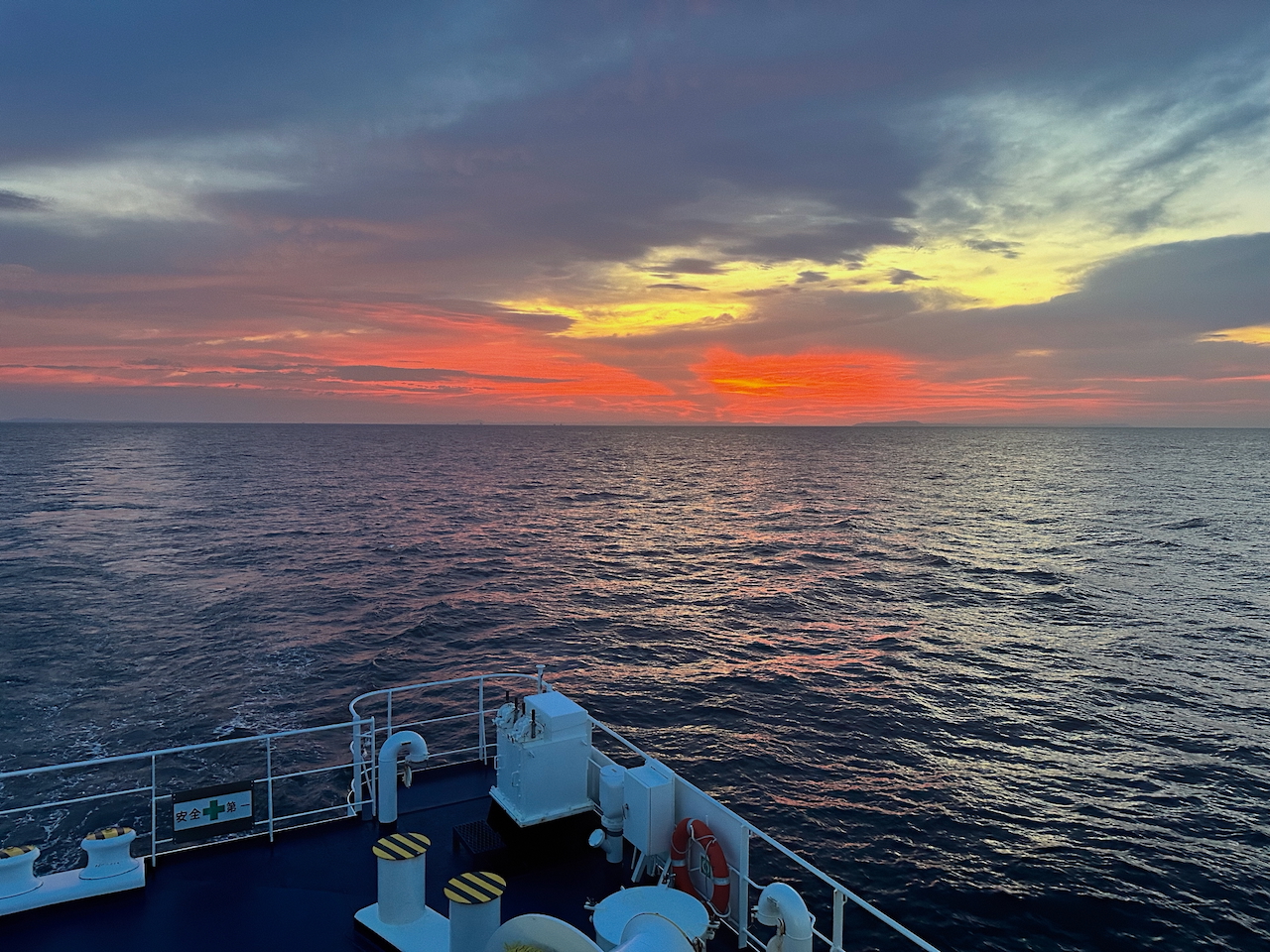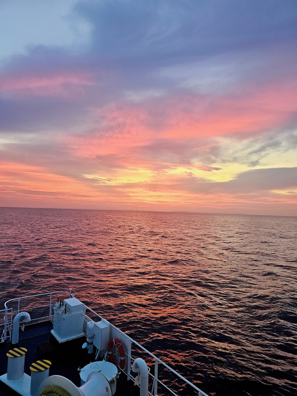 凌晨4點半,我刻意早起,在灌滿海風的甲板上等待天色漸亮。
