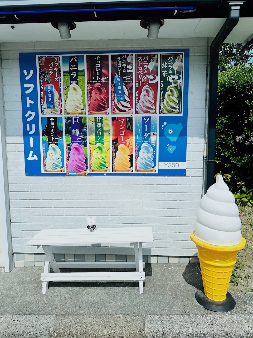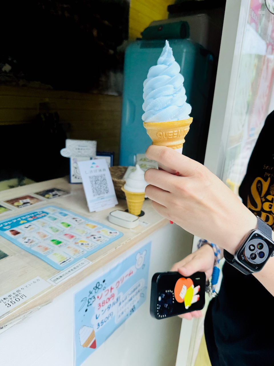 於是,做夢也沒有想到,剛才還拿著歌手周邊娃娃忙著拍照的我們,此刻就站在霜淇淋店舖的窗口,看著娃的主人宮川君一邊對我們閒話家常,一邊細心地為我倆細心地做出霜淇淋來。猛暑中,沁涼的霜淇淋入口,融化了,真不知道甜的是嘴還是心了……