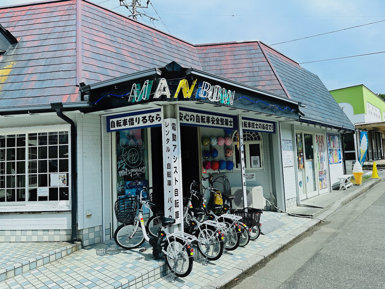在島內的移動,除了徒步以外,租輛腳踏車尤佳。島上有許多出租自行車的店家,但不用考慮,我選擇的只有一家。那就是宮川大聖老家開的租車店「MANBOW」。這裡是宮川大聖小時候居住的地方,雖然現在一家人都搬到本州居住了,但老家仍在,店面也持續經營。