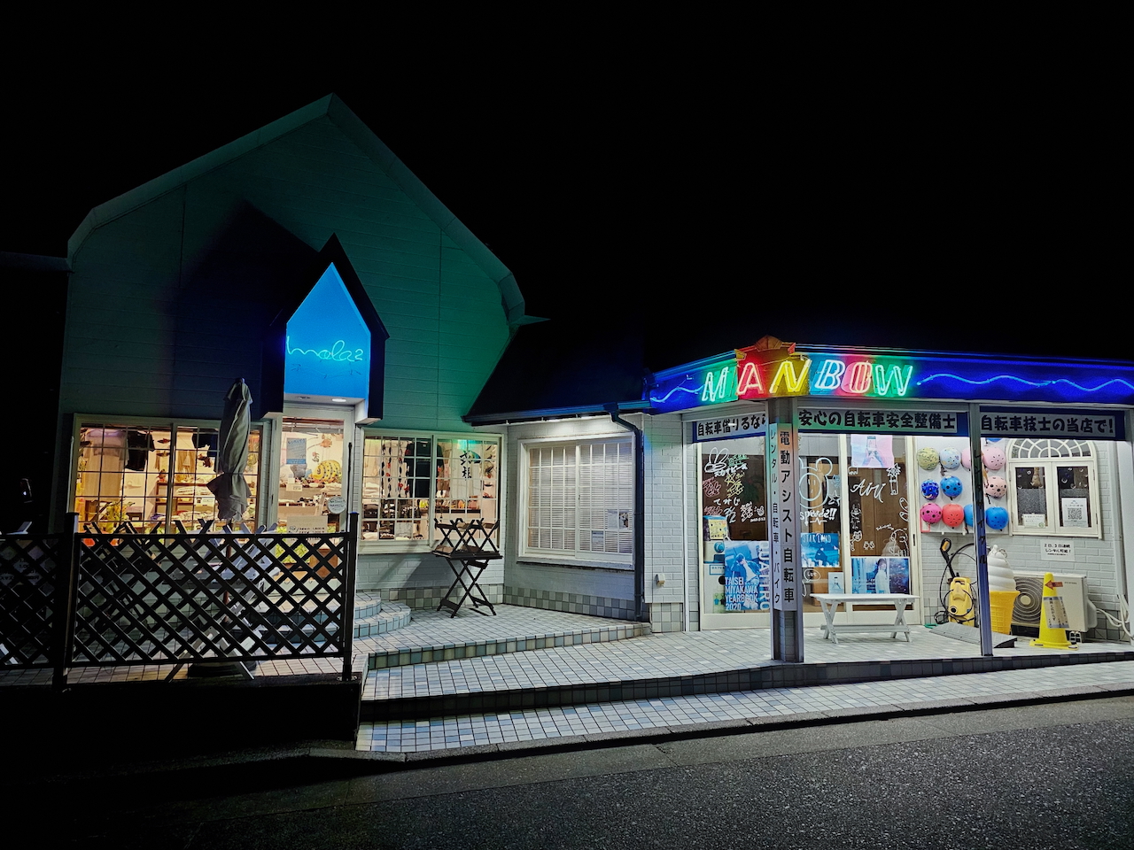 片刻後,我們站在店門前,在靜謐得只聽見蟬鳴的夜色中,看著MANBOW的字樣劃破黑暗,點亮霓虹燈。