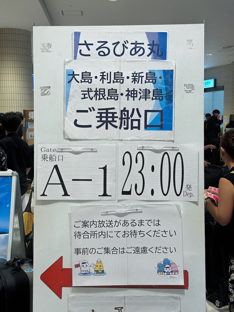 從東京灣出發前往式根島的渡輪,在距離JR濱松町站不遠的竹芝棧橋啟航。出發這天,正逢日本盂蘭盆連假的第一晚,碼頭大廳擠滿遊客,熱鬧景象不輸繁忙的機場。我很驚訝,原來有這麼多人選擇搭夜船,奔赴各自的離島假期。