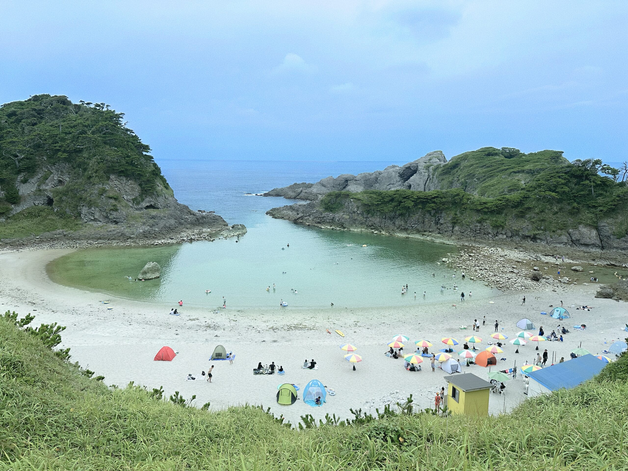 沙灘呈優雅的扇形,懷抱著碧綠的海洋,延伸至天際,海天一色,構成令人屏息的絕景。難怪如今只要媒體提到式根島,畫面總會出現這裡。