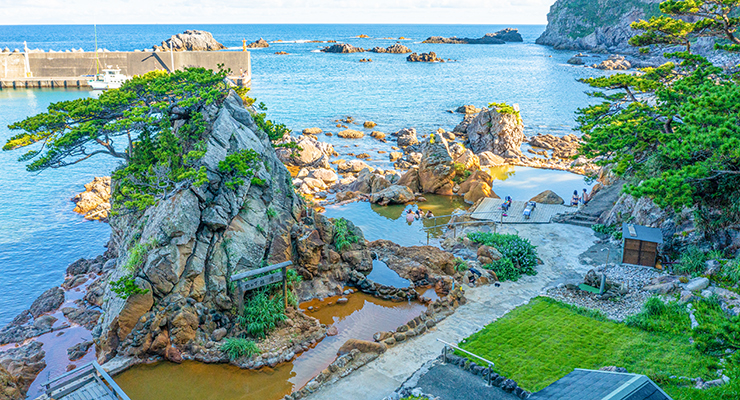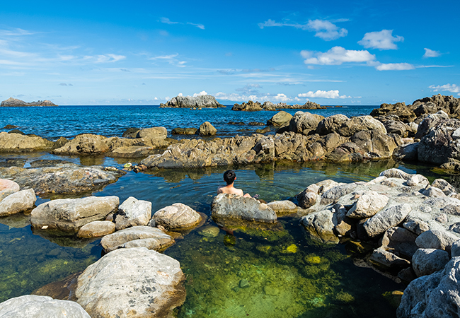 式根島另一項迷人的體驗,莫過於島上的溫泉。其中有三座知名的免費天然戶外溫泉。「地鉈溫泉」隱身於海蝕斷崖下的岩場,泉水從地底湧出,熱度隨潮汐起伏而變化;「足付溫泉」位在岩礁與沙灘之間的潮間帶,泉水自然滲出,腳邊偶爾還會有小魚悠游,是孩子最愛的戲水去處;「松が下雅湯」是由島民整理而成的海濱露天浴池,這三處溫泉的共同特色是完全融入自然環境,不需門票,展現了島民與環境的和諧共生。