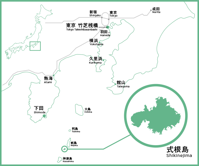 式根島沒有機場,抵達這座島嶼的方式,是搭客船從竹芝棧橋直航,或搭飛機先去新島,再從新島搭連絡船來到式根島。