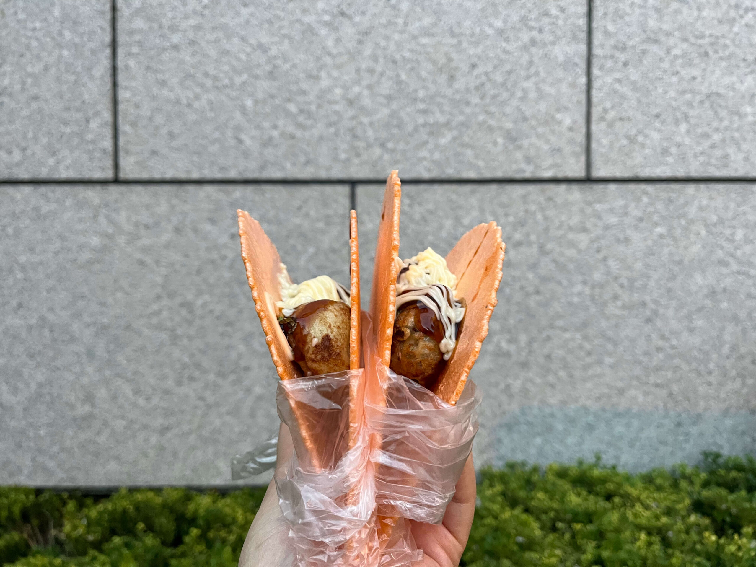 「章魚仙貝」是將章魚燒夾在薄薄的仙貝中間,並用袋子包裝,非常適合邊走邊吃。值得注意的是,這裡只能付現金,建議先確認攜帶足夠現金再前往購買喔!