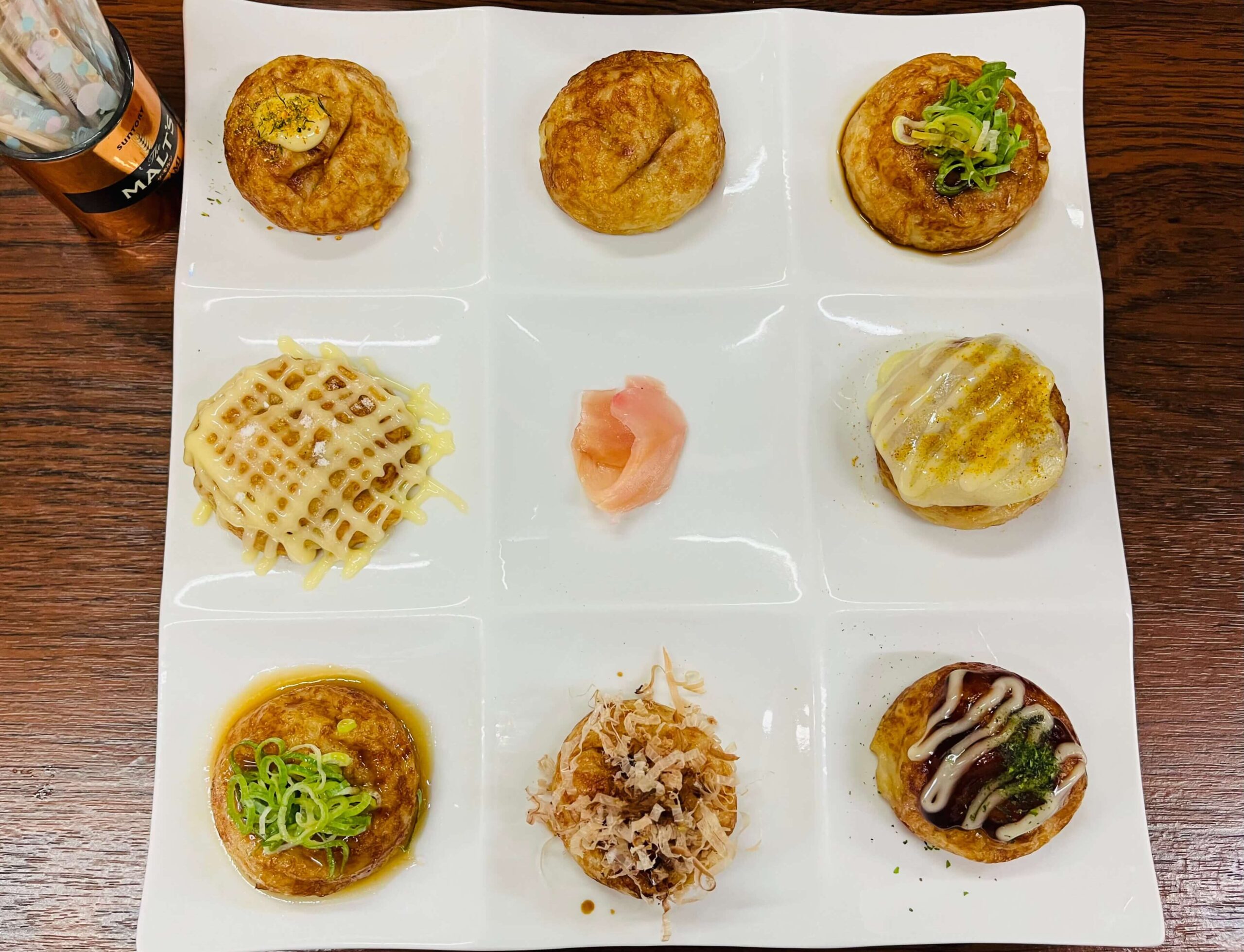 八種不同風味的章魚燒整齊排列在精緻的餐盤上,每種口味都有其獨特的擺盤和裝飾,讓人在品嚐美味之前,就能先飽覽一頓視覺盛宴。