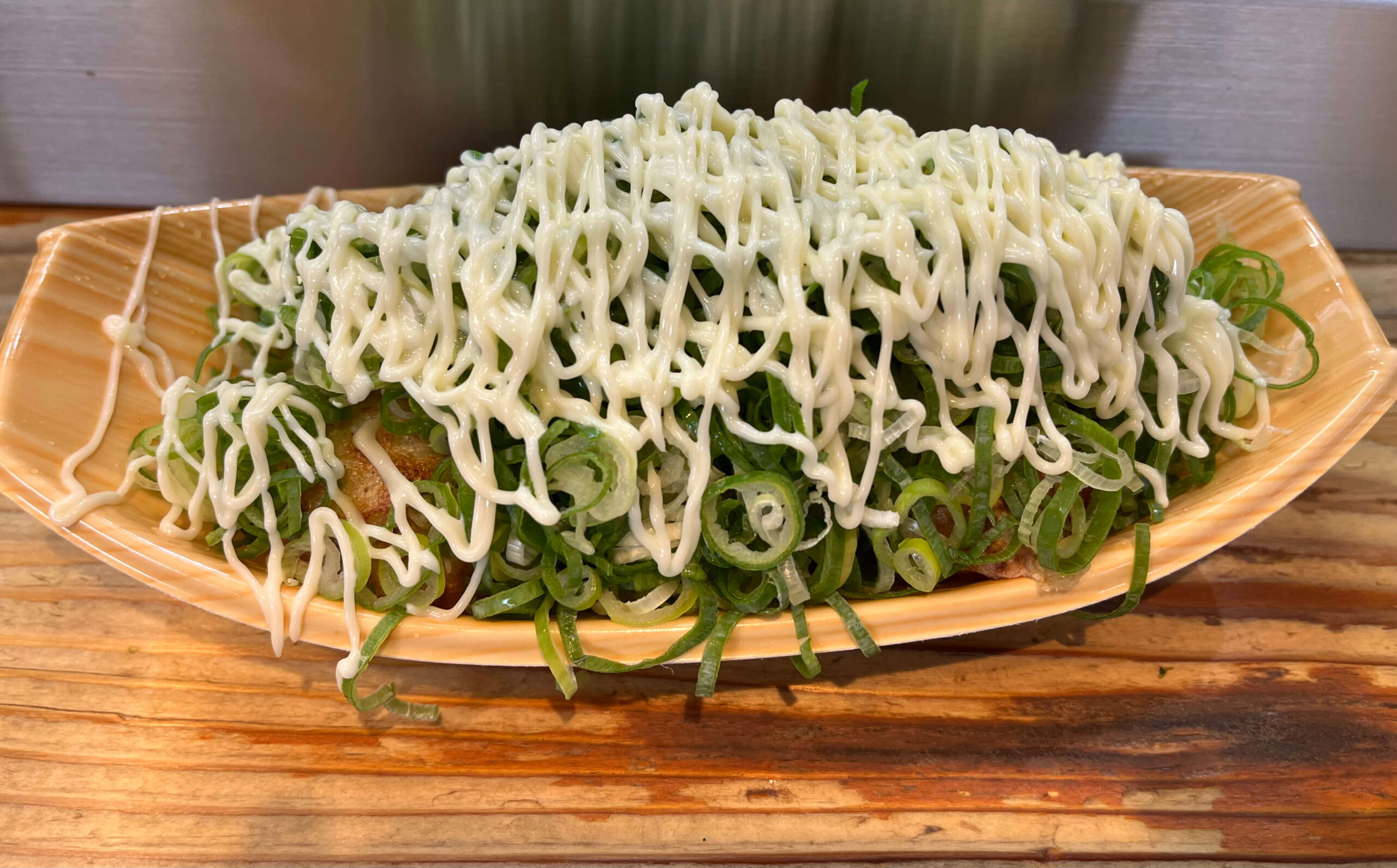 「蔥花美乃滋」的特色是滿滿的蔥花幾乎覆蓋整個章魚燒,美乃滋擠在蔥花表面,清爽可口。章魚燒醬、鹽醬油、柚子醋醬、醬油、鹽這五種調味料可以選擇,也可以選擇什麼都不加。