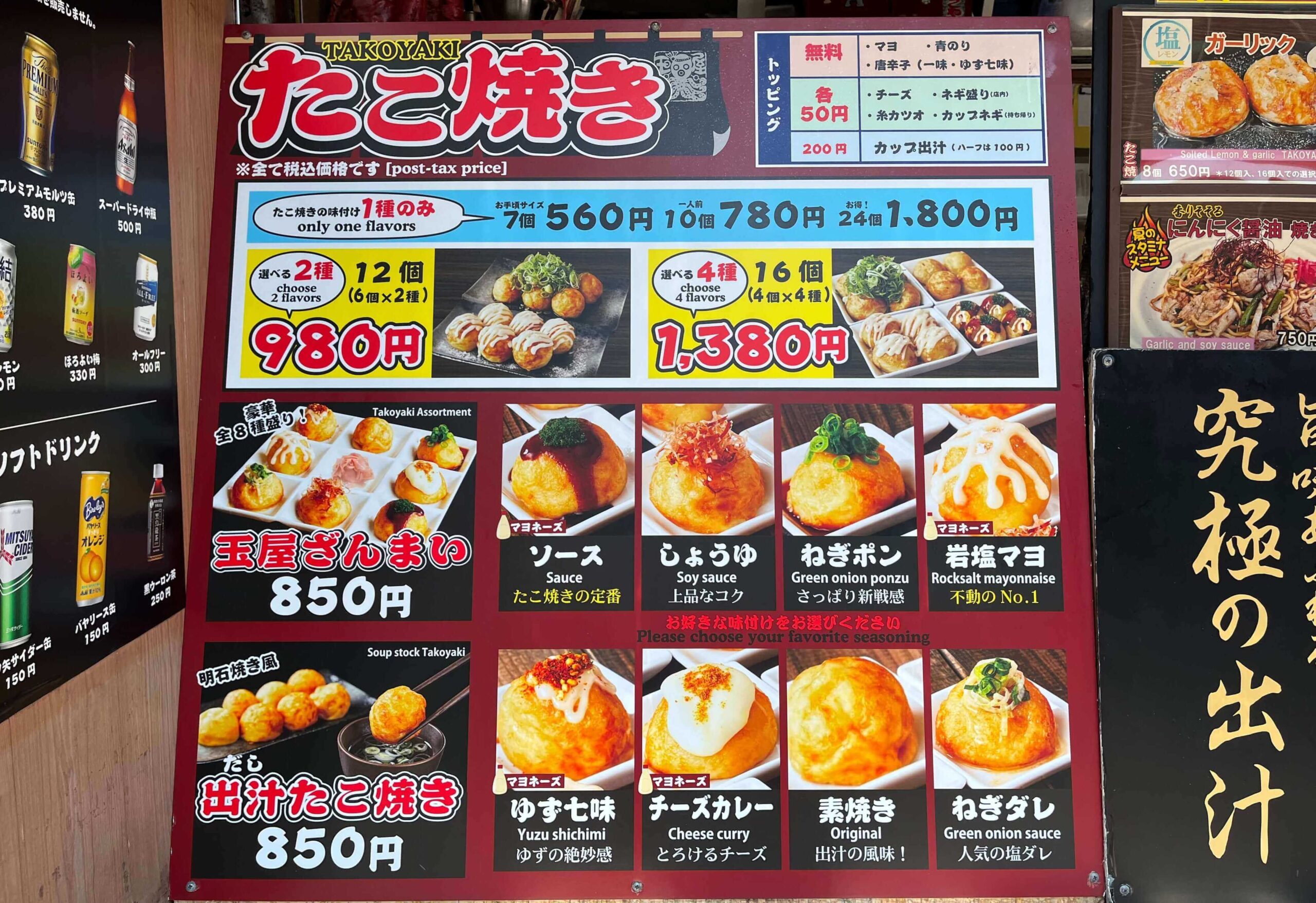 店內供應八種不同風味的章魚燒,從最能品味食材本質的原味,到搭配經典醬料的傳統風味。清爽的岩鹽美乃滋、深沉的醬油風味、清新的蔥花柚子醋、經典的蔥花醬油、濃郁的起司咖哩,以及帶有柑橘香的柚子七味。