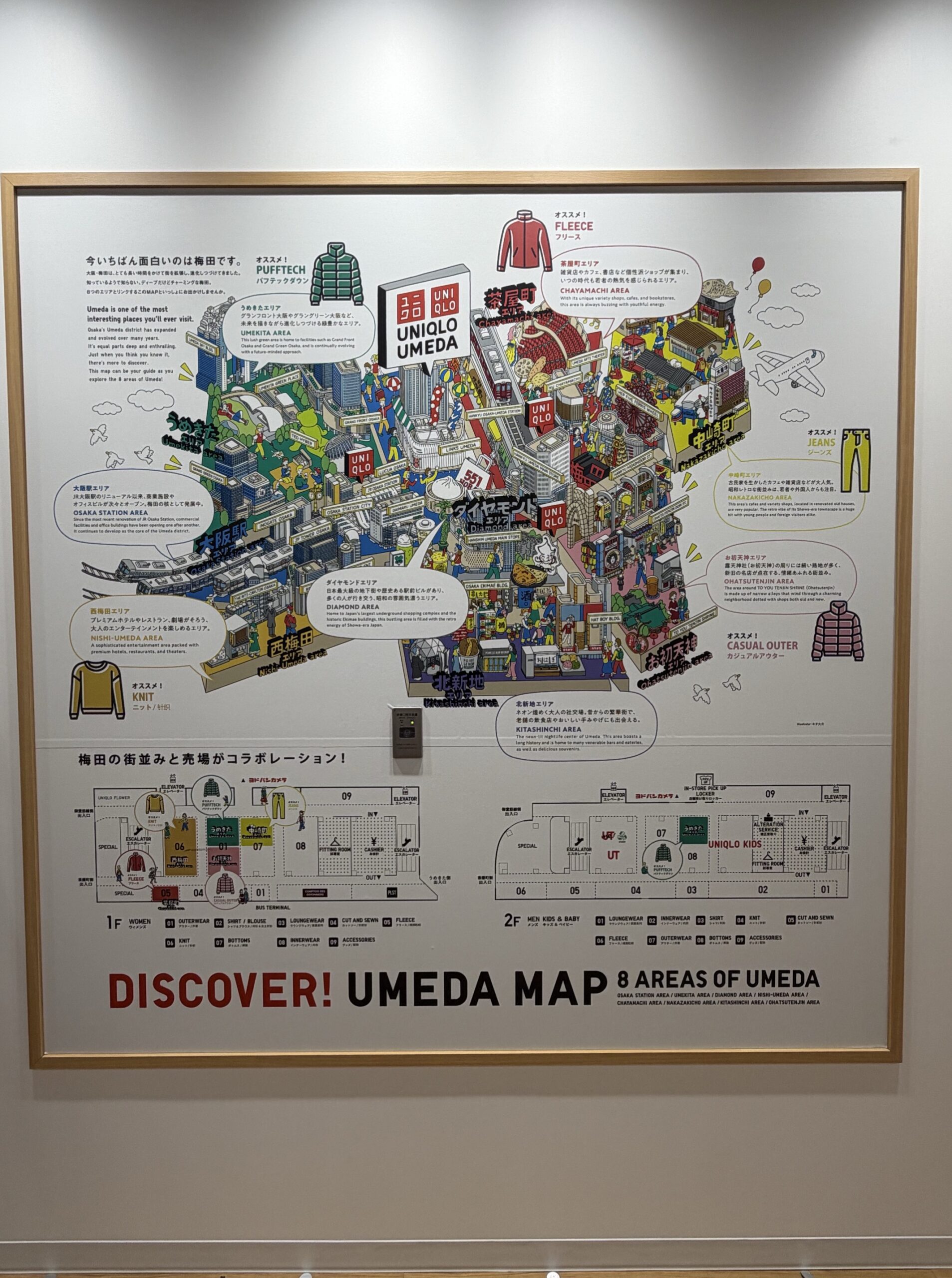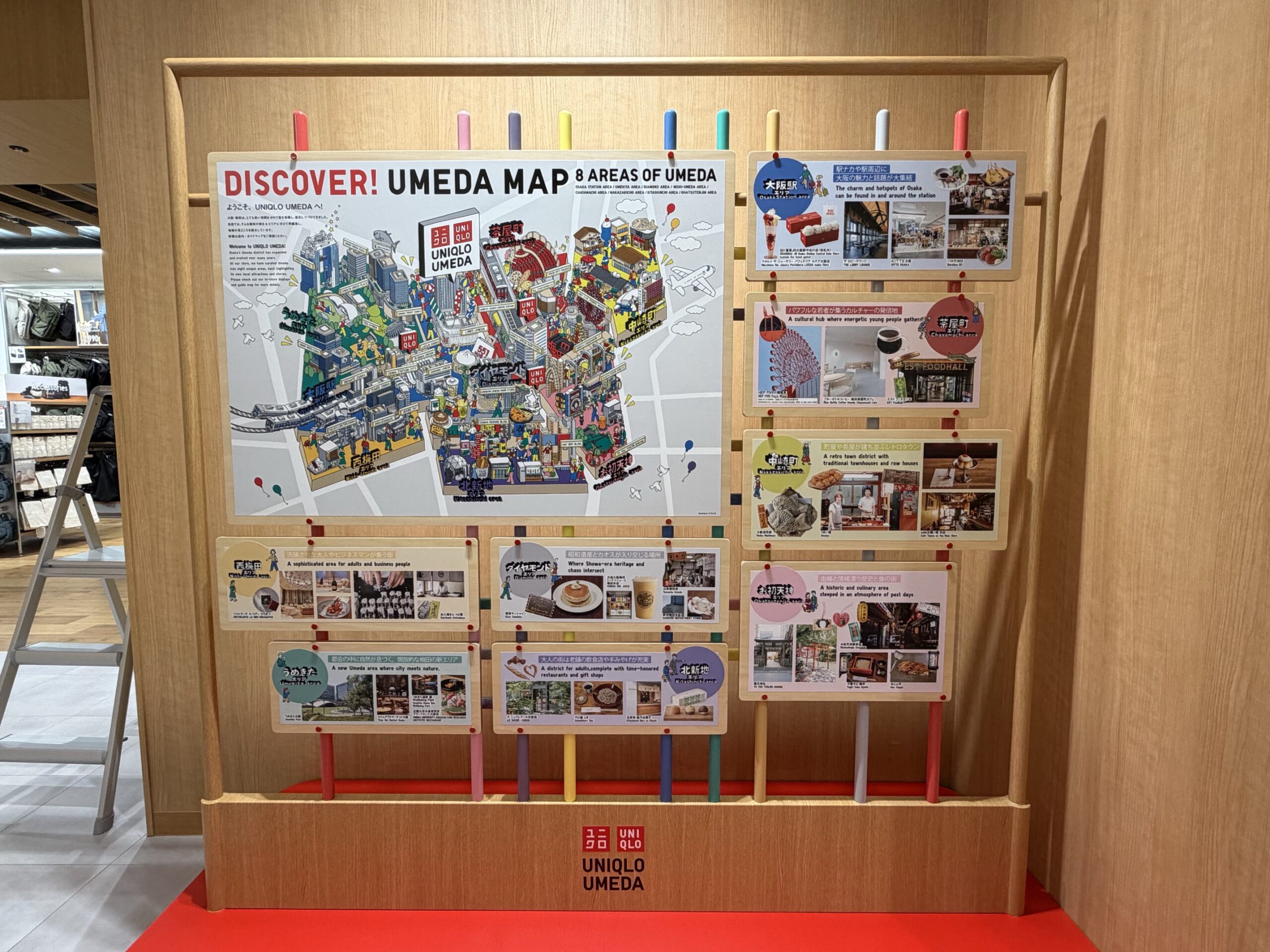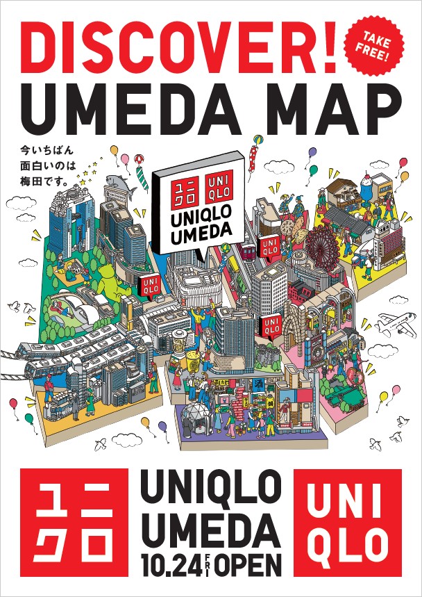 UNIQLO特別製作「DISCOVER! UMEDA MAP」,以「うめきた」、「大阪站」、「茶屋町」、「中崎町」、「お初天神」、「北新地」、「ダイヤモンド」、「西梅田」八大區域介紹梅田的景點與美食,日英對照版本,讓外國旅客也能輕鬆探索這座城市。