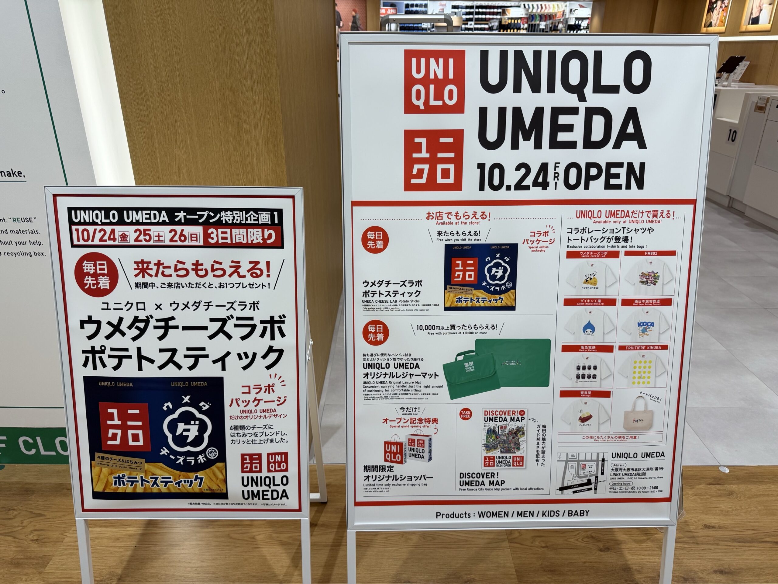 開幕首三日(10/24–10/26),凡單筆消費滿一萬日圓,即贈「UNIQLO UMEDA 原創休閒墊」,以綠意梅田街景為主題設計,方便折疊收納。