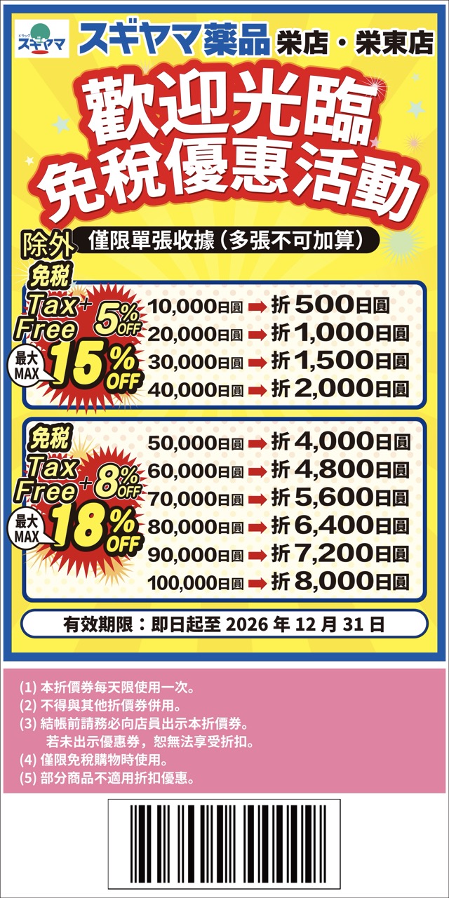 「Sugiyama 藥品」提供《步步日本》讀者專屬優惠券,購物前可先確認商品是否可使用優惠,結帳時向店員出示優惠券,即可輕鬆折抵,享受超值的購物體驗!即使是第一次造訪名古屋的旅人,也能輕鬆體驗日本在地藥妝的貼心服務與划算價格。此外,設有免稅專用櫃檯,可輕鬆享受免稅服務。